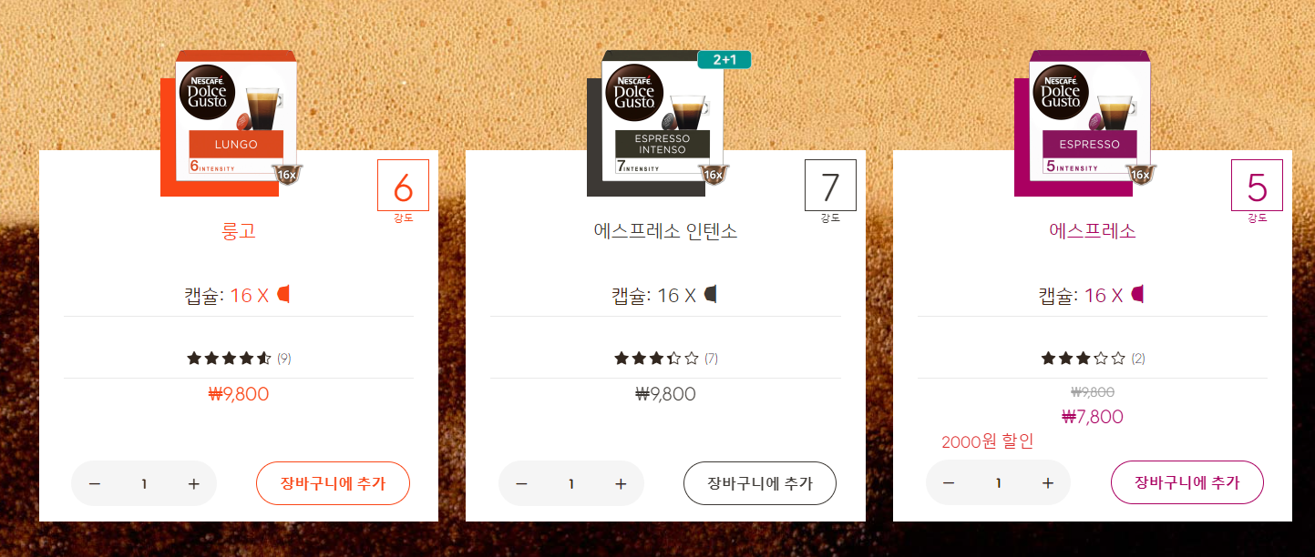 네스카페에서 나온 캡슐은 16개에 10,000원이 안되서 더 저렵합니다. 지금 홈페이지에서 2+1 행사하는 상품도 있으니 한번 둘러보세요. 저도 캡슐 떨어지면 당황스러우니까 쌀 때 쟁여둬야겠어요. 그리고! 캡슐은 항상 돌체구스토 호환되는지 확인하고 사세요. 박스에 돌체구스토라고 표기가 되어있는 거 사셔야 해요. 네스프레소 오리지널과 버츄오 캡슐은 돌체구스토랑 호환이 안 됩니다.